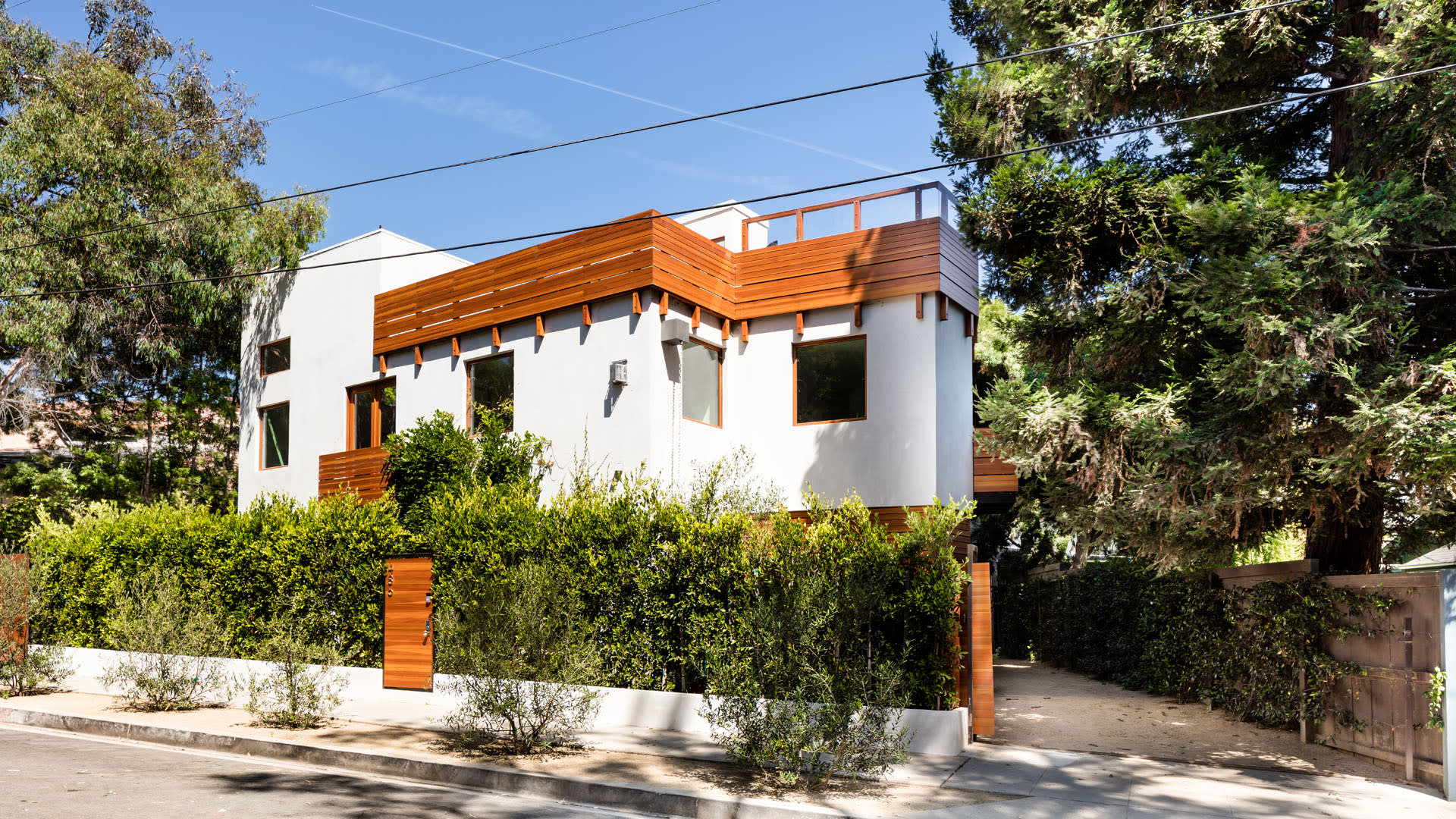 Modern living in this exceptional Studio City haven is proof you really can have it all! Desirably set in the sought-after Silver Triangle neighborhood, this stunner, once the quaint cottage featured in the beloved "Malcolm in the Middle" TV show, has been impeccably transformed into a contemporary masterpiece. Drawing inspiration from Mid-century modern design, its impressive facade sits on a gated lot perfectly placed on a picturesque tree-lined street. Past the pivot entry, a long list of must-have features is displayed throughout the sleek interior. Thoughtfully crafted with high-end finishes, the sweeping 4-bedroom, 4-bath layout has generously sized entertaining areas under soaring ceilings. Skylights pair with an expansive picture window and chic globe lighting to brighten your open-concept living room. From the warmth of the dramatic linear fireplace, enjoy a seamless flow to the chef's kitchen. With professional-grade stainless steel appliances and gleaming marble countertops accentuating emerald cabinetry with brass hardware, it's truly an inspired culinary space. Gather guests at the oversized waterfall island or share intimate meals in the chandelier-lit dining area. A built-in beverage fridge and wine rack are conveniently located just steps away. Sleek tile flooring continues to the sunlit family room where you'll find tons of built-in storage and glass sliders opening to a secluded patio. A dramatic centerpiece in the home, a floating staircase leads to the upper-level private retreats. Each exudes a unique personality with distinctive wallpaper that beautifully contrasts the crisp white tones while adding depth and texture. Double doors reveal a luxurious primary suite that pampers you with a striking linear fireplace, custom built-in shelving, and access to the large rooftop deck. Before you call it a day, sip a refreshing nightcap as you watch the sun sink on the horizon. Indulge in a spa-like bath in the luxe ensuite with dual vanities, an oversized walk-in rainfall shower, and a deep soaking tub. Unwind in seclusion on the covered patio's swing - the perfect spot to appreciate your backyard oasis surrounded by lush bamboo. An outdoor kitchen complete with a built-in BBQ, beverage fridge, and a prep area ensures hosting weekend celebrations in the cabana by the pool is a breeze. Bonus items include sub-level storage - ideal for a wine cellar and an insulated sound room. A fabulous location places you in the Carpenter School District, and you'll have close proximity to the city's numerous shopping, dining, and entertaining options. With so much to explore, why just read about it? Come make this gem yours before it's gone for good!