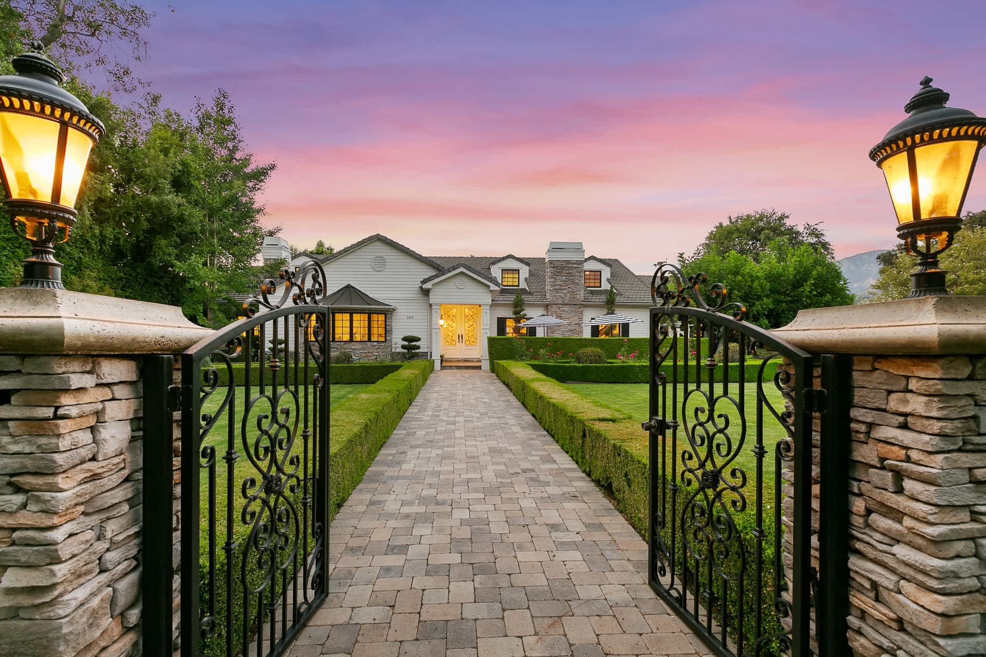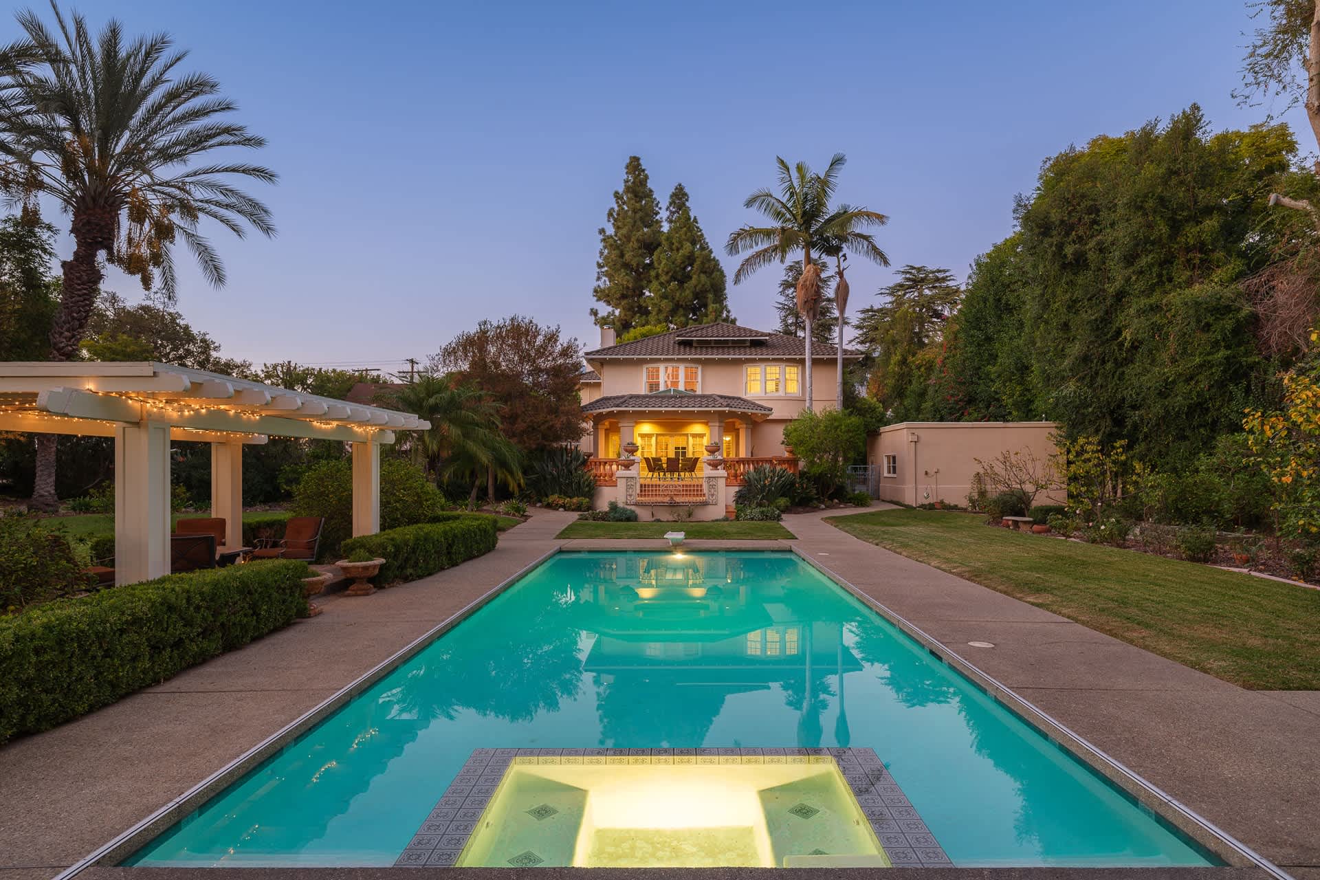 This stunning 1910 gated Italian Renaissance Revival estate has been impeccably done with exquisite finishes and luxurious appointments throughout. The stately property is an architectural beauty and registered as a historic landmark, offering significant tax savings for the buyer through the Mills Act. This is a once-in-a-lifetime opportunity to own a true Pasadena treasure. The magnificent five bedroom, five bathroom home, with two bonus structures on the parcel, is filled with the elegance and grace of a bygone era. The residence sits back under tall, old-growth trees and has a welcoming circular drive that beckons you to the central entry that leads up to the hand-crafted oak door. The home is ideal for entertaining with its inviting front foyer, a substantial dining room, a lovely living room, a grand family room, a charming library or study, a quaint breakfast room, as well as a fully remodeled kitchen with everything a gourmet chef could desire. The upgrades are more than skin deep with updated plumbing, electrical, and sewer. The sleeping spaces offer one bedroom on the lower level and four bedrooms upstairs, including the retreat-like, light-filled, primary suite that features bird's eye maple cabinets, an oversized walk-in closet with built-ins, as well as windows overlooking the serene rear gardens. The lot has two additional living areas on-site. They are a 958 square foot guest house with a bathroom, decorative fireplace, and a bedroom mezzanine that would be perfect as a studio or office and, also, an original, 358 square foot, three-story water tower. It has been used as a playroom space, a party spot and, for one family, as their own private pub. The outdoor space is truly exceptional and showcases a resort-like landscape. Due to its exceptional scale and layout, the residence has been used to host fundraisers, galas, concerts for various charities as well as educational events for the Huntington Library. The yard makes one feel as if you are in a verdant, shade-dappled, hidden park with areas for recreation, relaxation, celebrating or, simply, quiet reflection. There is an outdoor kitchen with a barbecue and cooking area in addition to several peaceful patios. Lastly, there is a covered porch with an atrium off the rear of the first floor, that wraps the lower level of the estate, allowing access from the numerous sets of French doors that open out from the interior. No detail has been overlooked. Don’t miss this jewel in our fair Crown City.