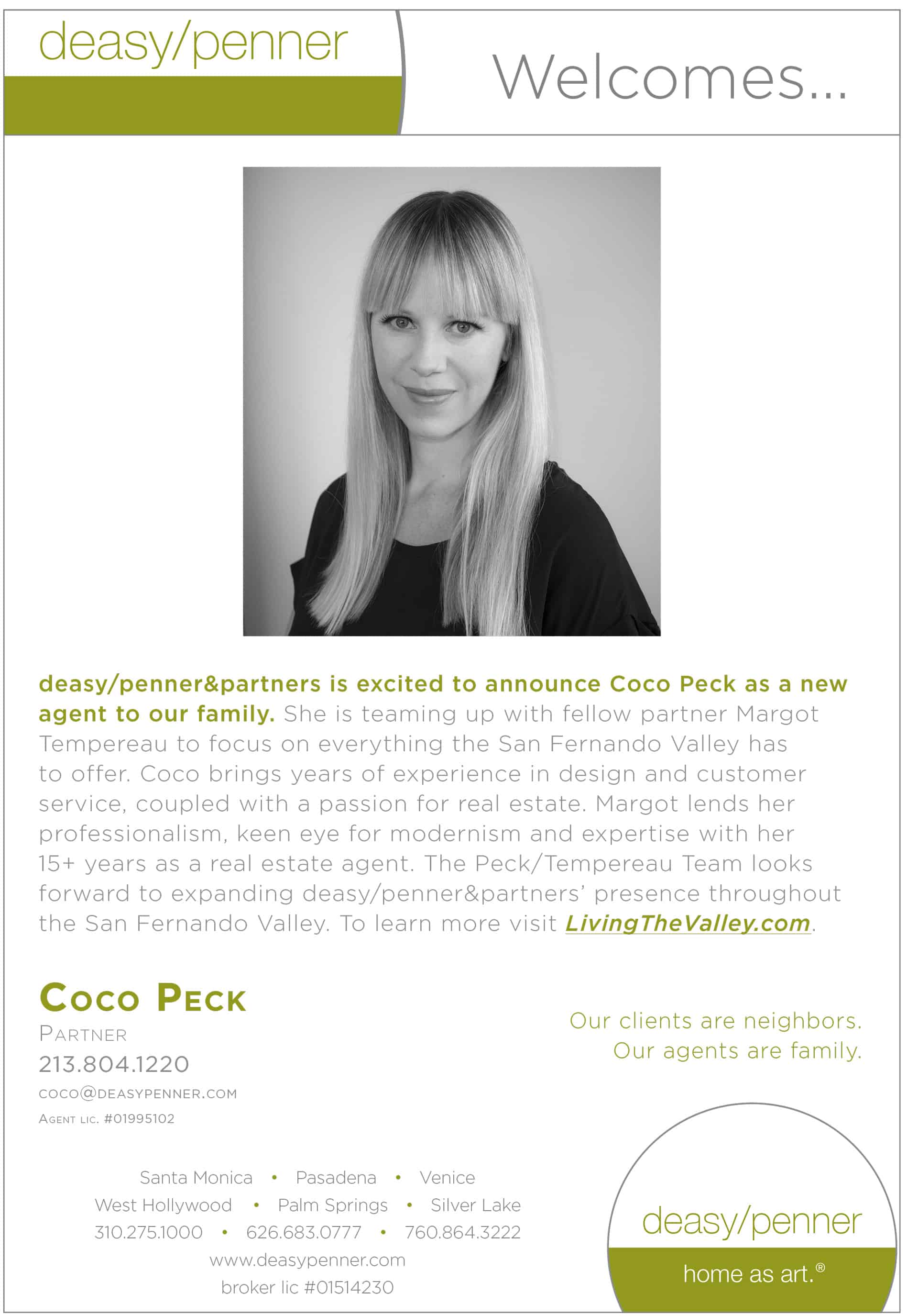 At Deasy/Penner, and in teaming up with modernist specialist Margot Tempereau, Coco offers her unparalleled design acumen, attention to detail, and passion for realizing each client’s home design dreams, coupled with her strong appreciation for Valley real estate, particularly the Valley’s extraordinary array of mid-century modern and ranch style homes and estates.