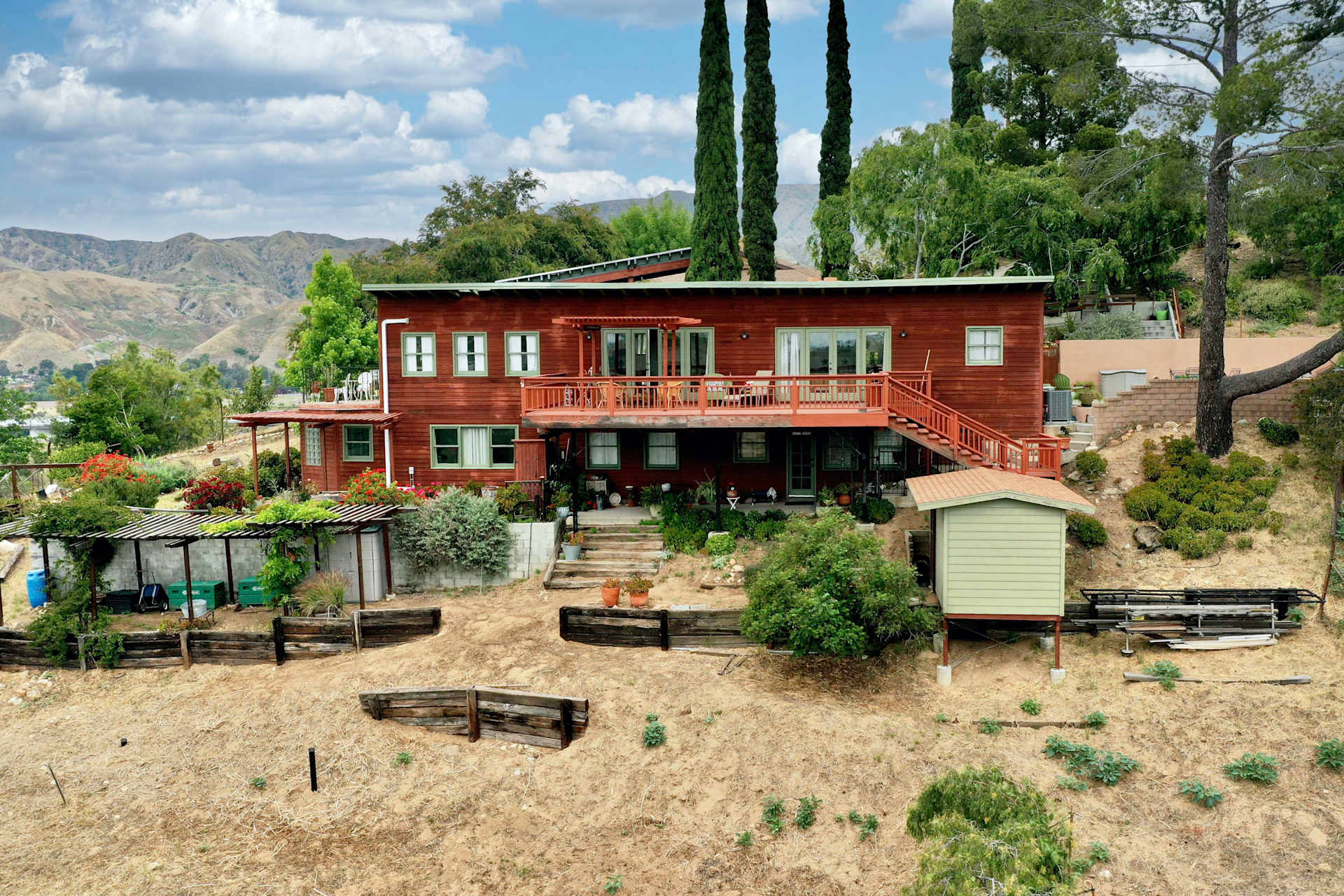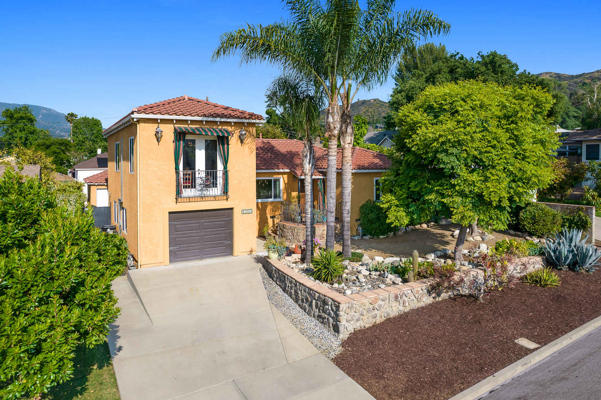 Located in a secluded and serene setting on a quiet cul-de-sac in the highly sought-after community of Shadow Hills and surrounded by views of the Verdugo Hills, San Gabriel mountains, and Santa Susana Pass. Opportunities to enjoy the magnificent scenery begin at the tranquil patio adjacent to the front door which is perfect for dining al fresco. This beautiful view home feels like an urban retreat removed from the city. The first floor offers a formal entry with two closets on either side of the powder room, a living room featuring a fireplace and saltillo tile floors, and a dining area with French doors that lead to an expansive redwood deck for entertaining under a custom-crafted pergola with shade. The spacious eat-in country kitchen is outfitted with custom-painted cabinets that offer generous storage, complemented by under-cabinet lighting, tile countertops, tile backsplash, and access to a cozy balcony to enjoy amazing sunset views. Completing the first floor is a separate pantry with additional storage and the back door to another outdoor sitting area on the front deck. Downstairs you'll find the primary bedroom suite with large ample closet space, a beautiful bathroom with large walk-in shower, and French doors that open to a lush garden. There are two additional bedrooms and a second bathroom with a claw tub for soaking. Notice the gorgeous views south and west from the deck where you can relax while dining and enjoying the foothills. The substantial rear garden with a storage shed and California pepper trees is entirely fenced and is a canvas for the new owners. With an easy commute to downtown Los Angeles, the studios in Burbank, and zoning for horses and agriculture this home offers tremendous opportunities to be close to nature and also near all Los Angeles has to offer.